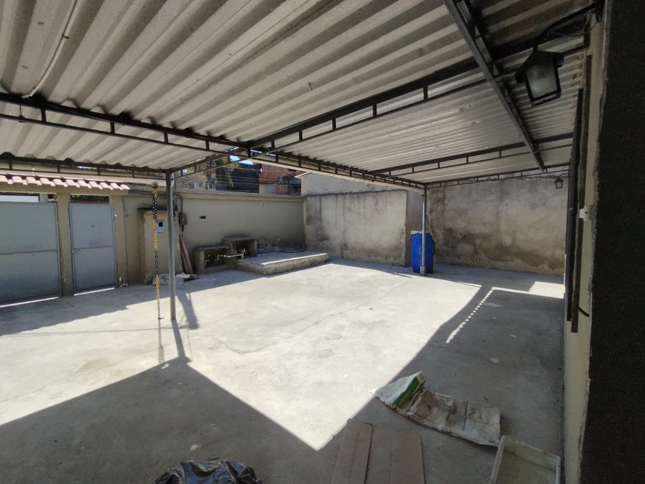Casa à venda com 4 quartos, sala, cozinha, 2 banheiros, um interno e outro externo, área de serviço, garagem para até 5 carros, e quintal nos fundos.